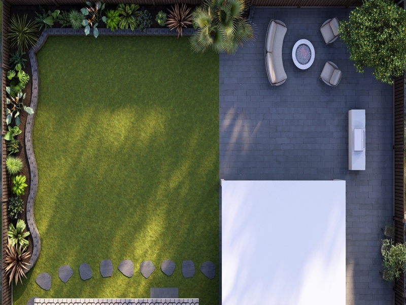 The backyard was redesigned into a comfortable outdoor living space that blends soft landscaping with functional hardscape areas. We installed new natural grass to bring the yard back to life and create a fresh, green foundation around the entertainment features.